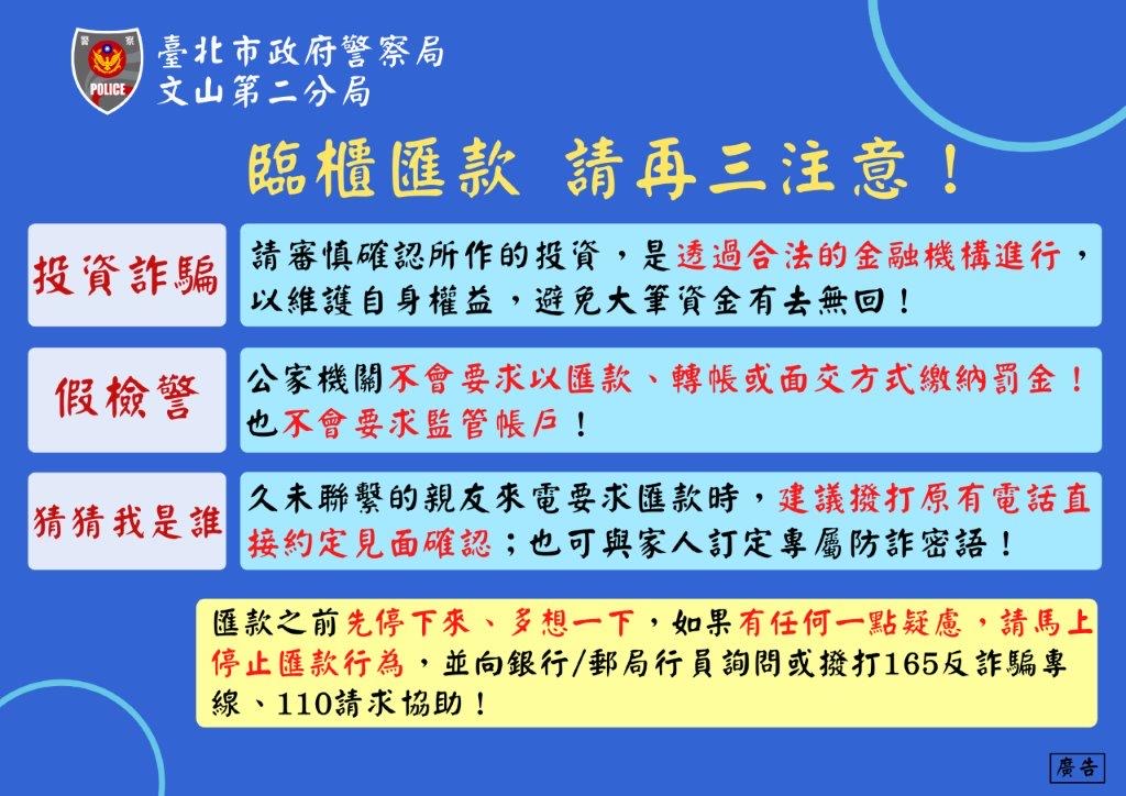 疫情以來,詐騙集團多以投資詐欺方式(虛擬貨幣、新科技概念股等)、檢警調查名義(假冒公務機關)等方式誤導民眾落入詐騙圈套;近期詐騙手法也緊跟時事改變,甚至有詐騙集團利用振興五倍券的「協助數位綁定」、「代辦紙本登記領取」之手段,藉此詐取民眾財產。文山第二分局分局長林明志向金融機構人員提醒,許多詐騙被害人都是利用臨櫃匯款或提領大筆現金的方式將錢白白送給詐騙集團,因此金融機構與警方的高度密切合作是成功攔阻詐騙的第一步,同時亦仰賴第一線行員們平時對於民眾異常狀況的觀察及關懷提問,若能及早發現民眾遭詐騙徵候,並立即聯繫警方到場釐清,便能大幅度提升成功攔阻詐騙的機率。