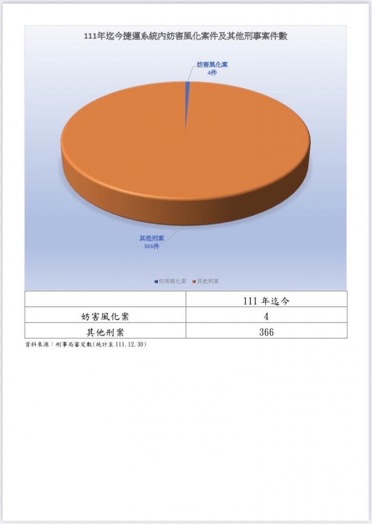 經統計111年迄今在捷運系統內之妨害風化案件計有4件,刑法第234條規定,意圖供人觀覽,公然為猥褻之行為者,處一年以下有期徒刑、拘役或九千元以下罰金。捷運警察隊呼籲捷運站體、車廂內密布監視影像,請犯嫌切勿心存僥倖,以免觸犯法網,悔不當初。