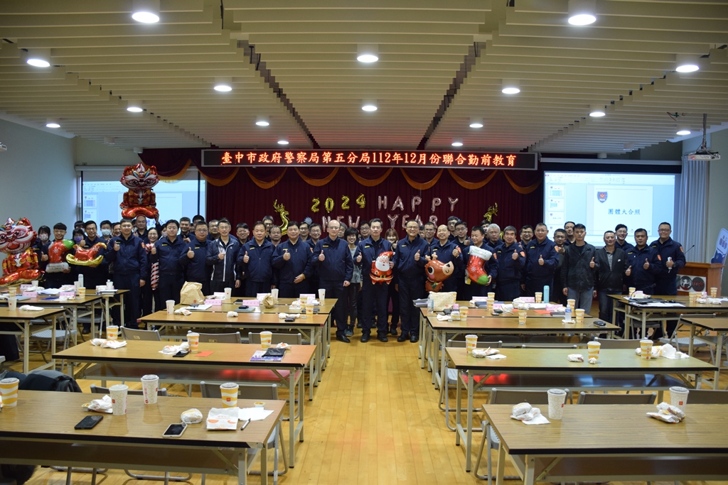 臺中市政府警察局第五分局長陳松寅體恤警察的辛苦,利用歲未最後一次聯合勤教機會,於昨(27)日下午準備了豐盛的麥當勞套餐,供與會員警享用,除慰勞大家一年來的辛勞,也希望讓選前勤務日益繁重的警察同仁,感受歲末年初佳節歡樂氣息。