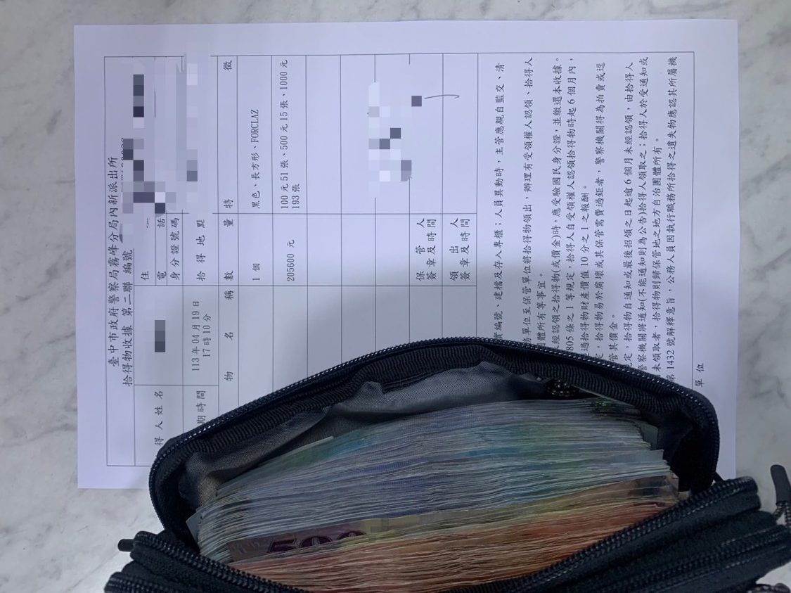 近日,內新派出所警員王銓福在16時至18時擔服備勤勤務時,接待了一位賴姓媽媽,她拿著一個包包內裝有新臺幣20多萬元現金到派出所。賴女士表示,她的兒子宋姓就讀明德國小四年級,於下午17時許回家途中,在明德街82巷與合作街口拾獲了這筆現金。擔心失主尋找,她急忙將錢物送至派出所,希望能協助歸還失主。
