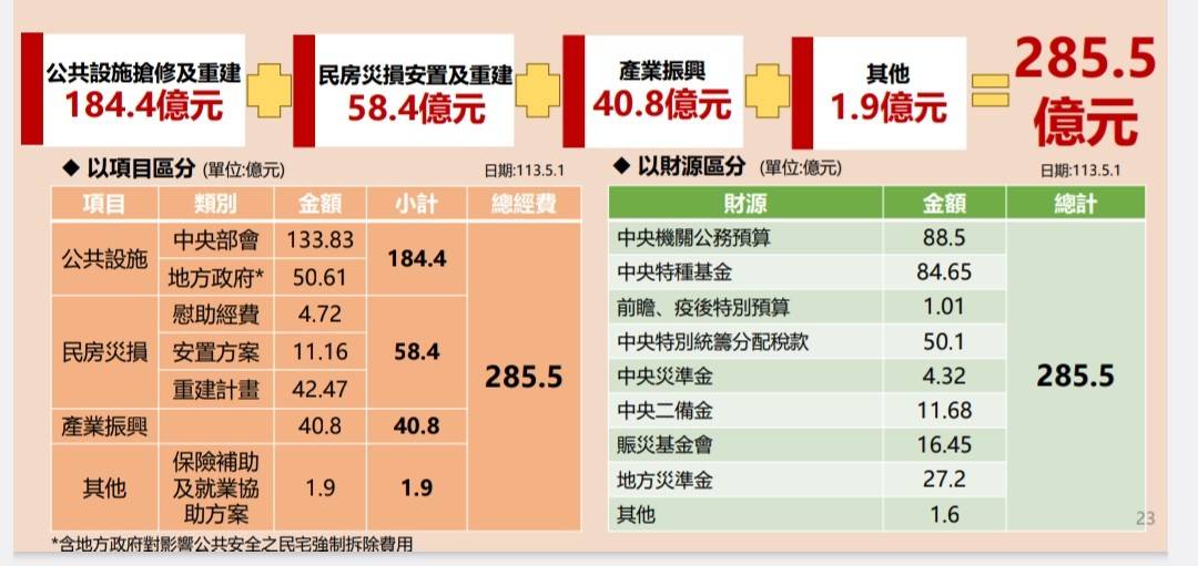 為完善0403地震災後復原重建工作之迫切需求,行政院2日通過了「0403震災復原重建方案」,合計總經費285.5億元。行政院表示,各部會將用心傾聽受災地方政府及受災民眾需求,提出災後復原及有利於地方振興發展之重建重點計畫,全力協助災民重建家園、紓困振興、安定人心。
