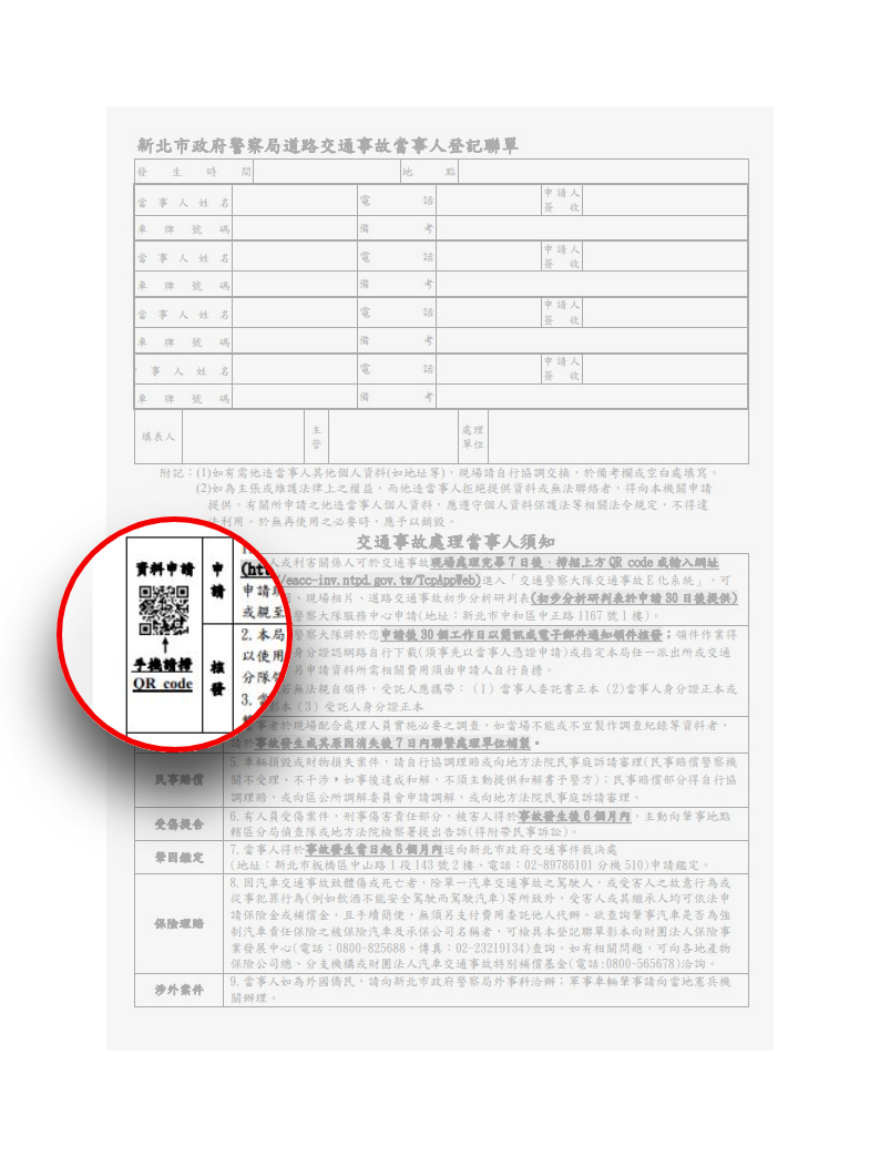 自112年11月1日起,新北警於道路交通事故當事人登記聯單中新增QRcode,民眾可透過手機掃描申請交通事故資料電子檔(包含現場圖、照片及初步分析研判表),並可於臨櫃或網路下載,提供民眾更快速便捷之申請及零距離領件服務。