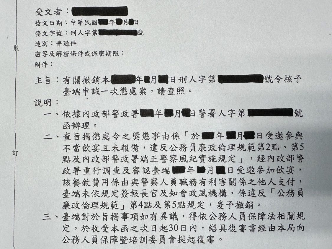 另事後部分遭懲處警官向保訓會申覆,以鍾國文為例,就不服懲處,亦經保訓會認定該處分混淆倫理規範標準(受贈三千元而非用餐三千元)又超過處分的時效,須撤銷處分。警署竟又以與警察職務有衝突之人員支付餐費之理由另進行處分,也就是無視該處分已超過時效已屬明顯違法,但是警政署就硬要處分,可謂「欲加之罪 何患無辭」。