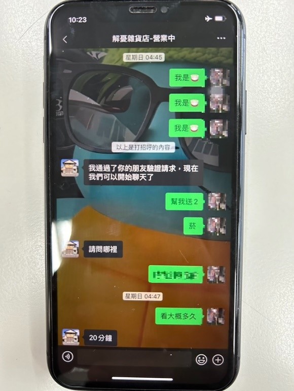警方蒐獲情資,有不詳人士以通訊軟體微信WeChat自稱為「解憂雜貨店」,推播「解憂新菜單上線囉!頂級高山烏龍 價格 NT2600/盒、隱藏版特殊茶款 價格 NT5000/盒、緊繃飲品 價格 NT500 買5送1 買10送3」等廣告訊息,疑似販售毒品,經深入追查發現柯姓男子(21歲)涉有重嫌,經報請臺灣臺中地方檢察署指揮偵辦,俟時機成熟,持拘票及搜索票緝獲柯姓男子及其集團成員共計5人到案,並查扣第三級毒品愷他命、K盤、分裝袋、磅秤及手機等證物。