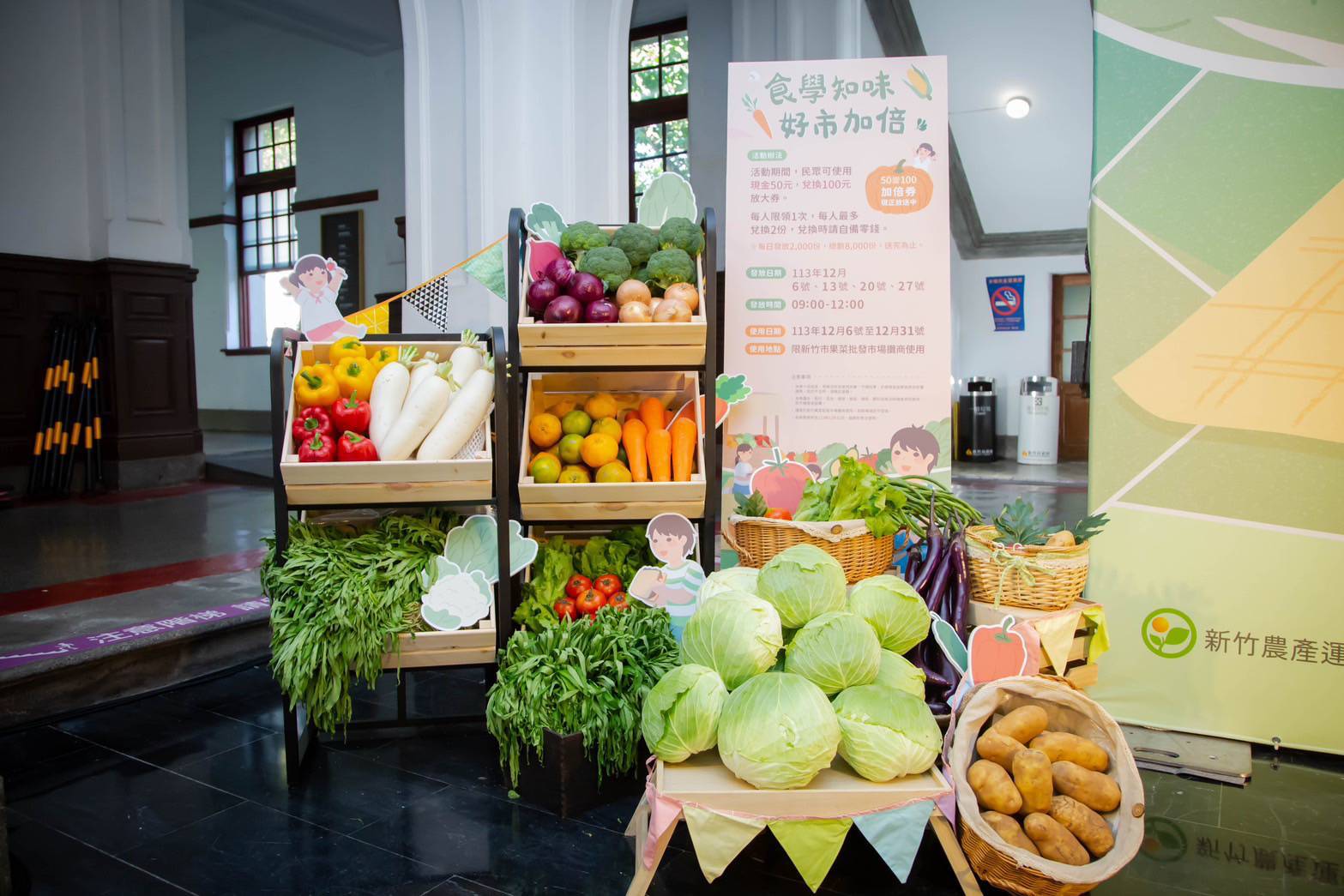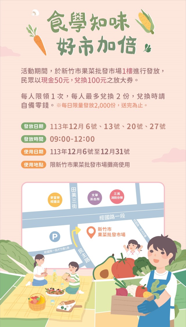 新竹農產運銷公司為推廣食農教育及振興市場經濟,2日在市府大廳辦理「食學知味 好市加倍」活動啟動儀式,規劃系列食農教育體驗活動,讓市民能透過活動學習食物來源的知識,並推出「好市加倍」消費放大券,12月6日起連續四個星期五,民眾可用 50 元現金兌換100元券,大排長龍的洶湧人潮可期。