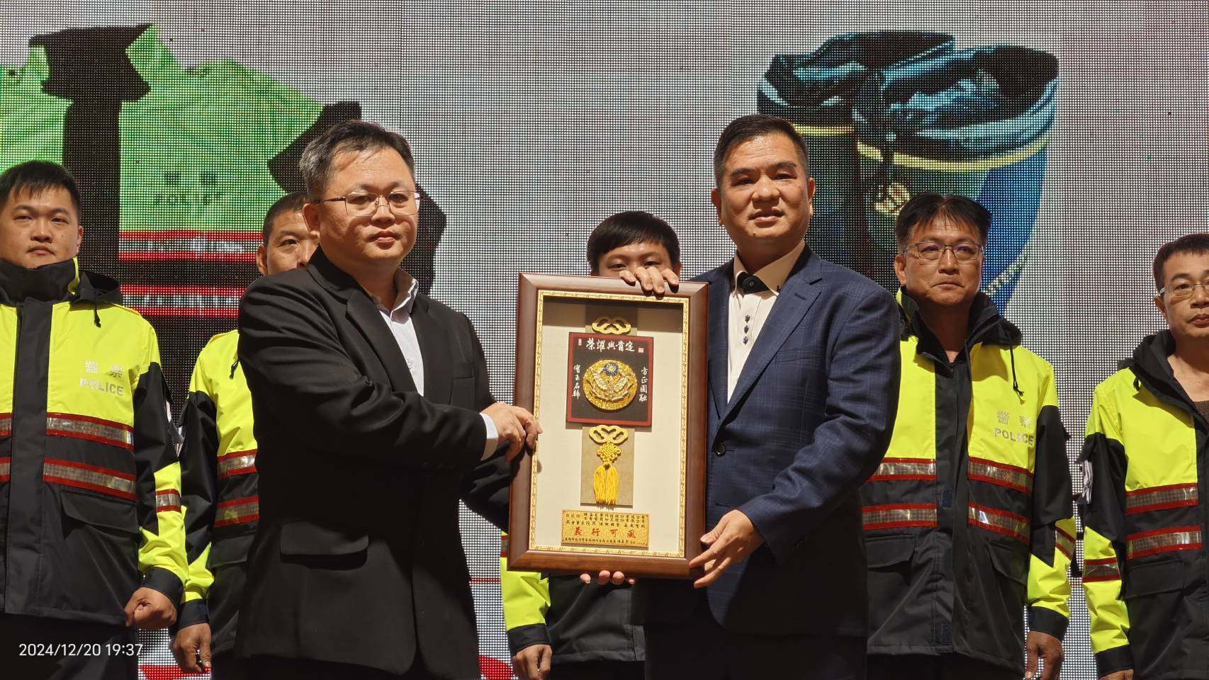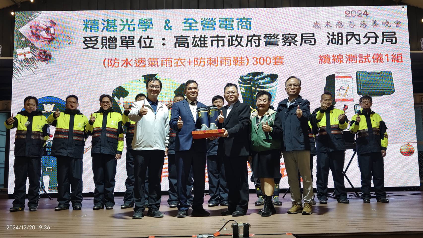 高雄市湖內區「精湛科技」展現企業社會責任,於2024年歲末感恩慈善晚會上,向湖內分局捐贈全新警用雨具裝備及監視器纜線測試儀,為基層員警執勤安全提供更完善的保障。