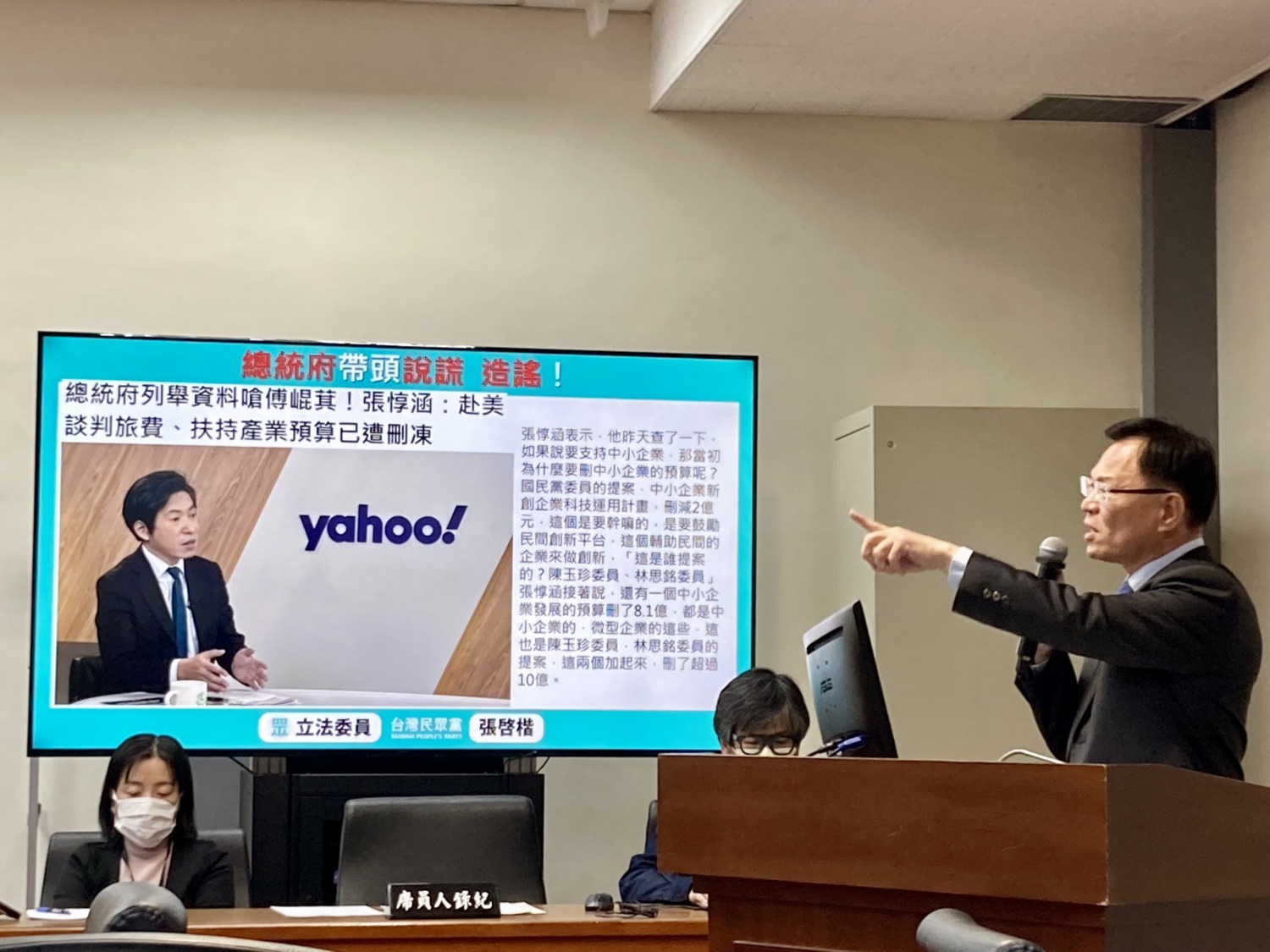 張啓楷說,張惇涵在專訪中表示,在野黨凍結了經濟部的基金,這是要扶植中小企業的培植,總共凍結了500萬;此外,還凍結中小及新創企業發展的獎補助,這筆預算本來是32億,被凍結了20%,也就是凍結了6.4億。