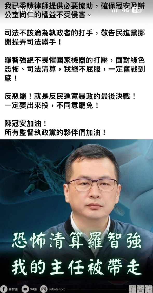 羅智強指出,陳冠安是他長期監督民進黨的重要幕僚,具高戰力,早已接獲線報民進黨將以「小案查大人」,藉搜索辦公室資料構陷在野人士。他強調此事並不意外,但對司法甘淪執政黨鷹犬深感痛心,並已委請律師協助維護權益。