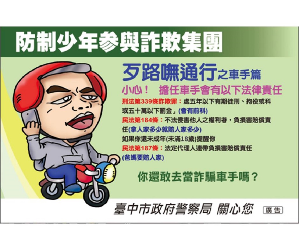 現在正值青春專案期間,臺中市政府警察局少年隊長高嘉陽特別呼籲,未成年擔任詐欺車手,被害人可依據民法第187條提起民事訴訟向詐欺車手的父母請求負連帶損害賠償責任。另少年事件處理法第84條也有相關處罰,法官可能會裁定少年的法定代理人或監護人必須接受8~50小時的親職教育輔導,如果沒有完成相關課程,還會有6,000~30,000元的罰鍰。之前有案例係未成年詐騙車手僅分得1萬元,卻遭法院判決父母須連帶賠償被害人230萬元。所以千萬注意不要落入詐騙集團的陷阱,成為詐騙集團的幫兇,找工作不成反而因此吃上官司,得不償失。另外父母及家長也應多注意孩子在外行為及交友狀況,避免淪為犯罪工具,警方將持續針對詐騙集團幕後成員加強查緝。若發現可疑請撥打165反詐騙專線、110電話查證或洽詢「勞動部勞動力發展署」專線電話:0800777888。
