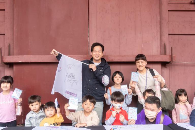 ▲邱臣遠代理市長披風彩繪完與孩童進行合照…