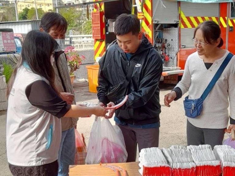 ▲第八公墓服務站民眾領取鐮刀。(圖/記者張…