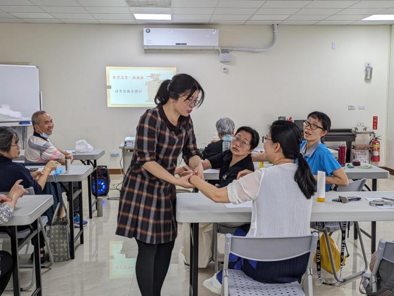 ▲家庭照顧者小芳,教其他照顧者們經絡按摩…