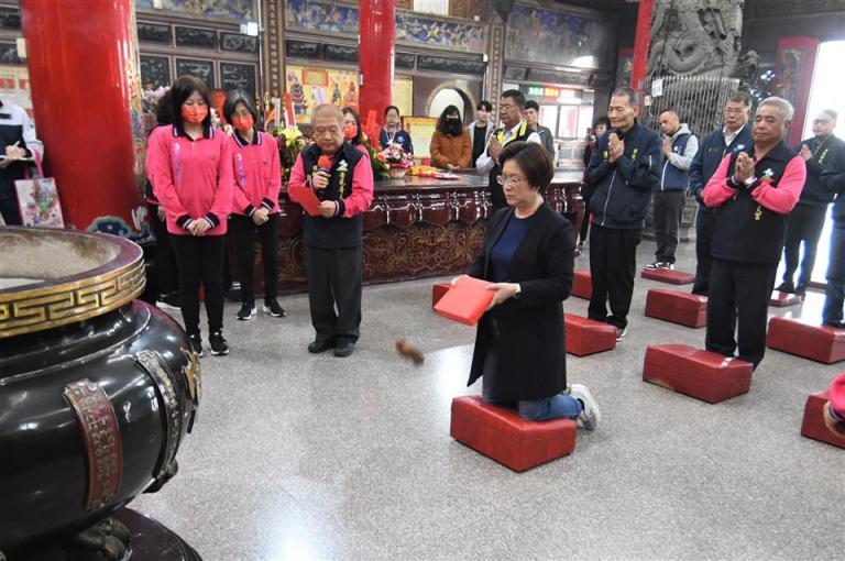 ▲彰化縣長王惠美18日在芳苑鄉芳苑普天宮擲…