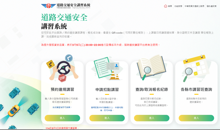 ▲道路交通安全講習系統首頁畫面。(圖/高雄…