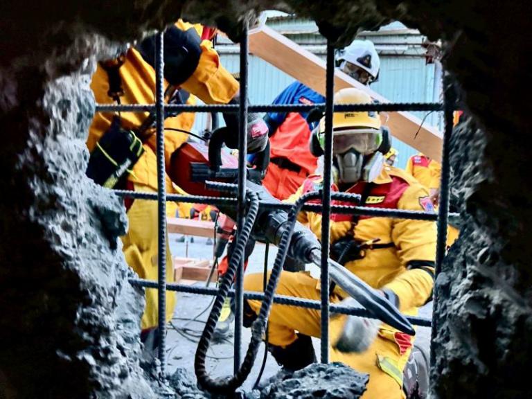 ▲竹市特搜人員進行災害現場救援實兵演練。…