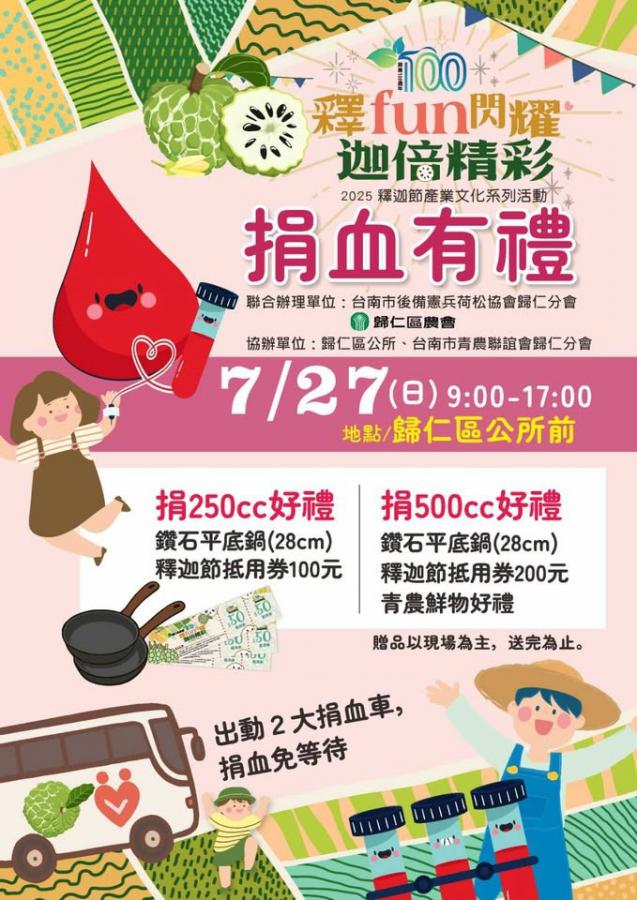 歸仁釋迦節系列活動 生命之源、獻出愛心7/27捐血公益活動