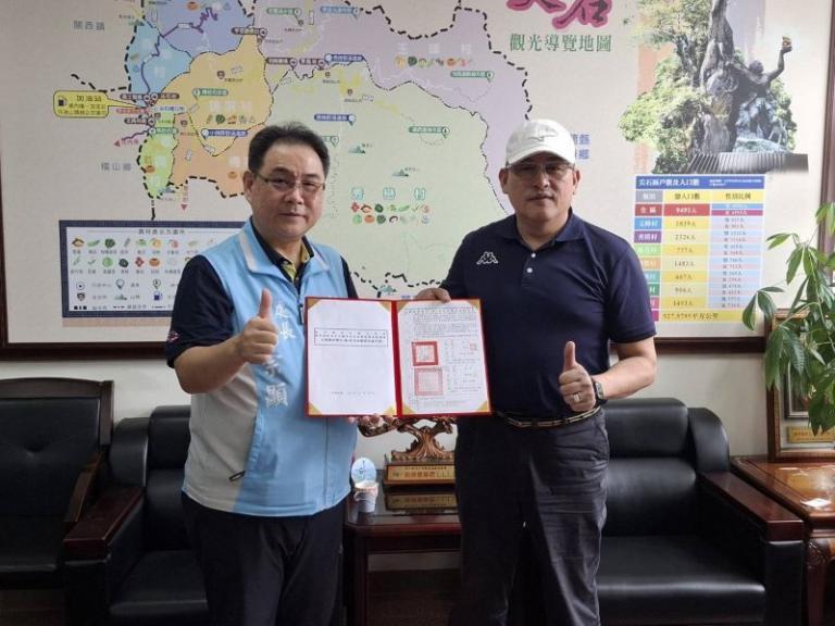 ▲鞠宗顯處長(左)與尖石鄉曾國大鄉長(右)簽…