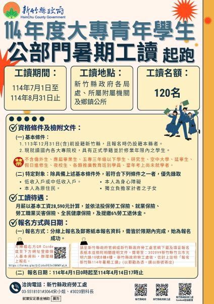 ▲新竹縣暑期學生工讀機會,即日起開放報名…