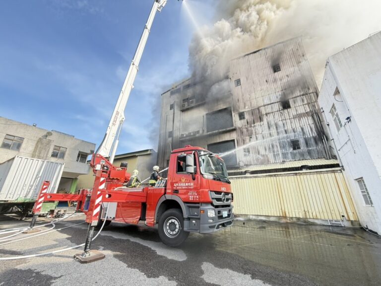竹北工業公司大火警濃煙沖天,消防隊員出…