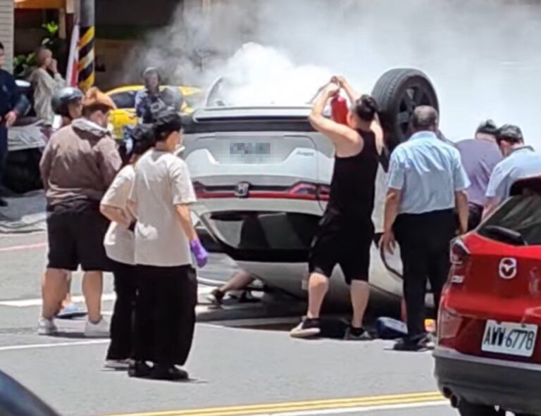 ▲白車被撞翻後狂竄白煙,相當驚悚。(圖/…