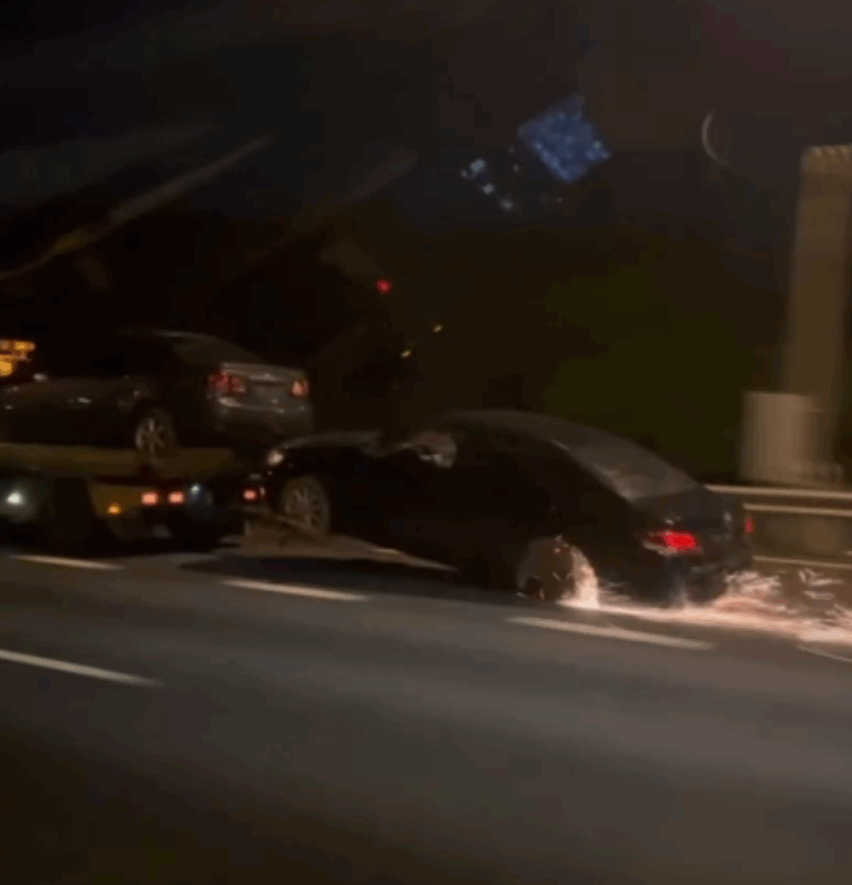 國道被拖吊車輛疑因輪胎掉落車體磨擦地面…