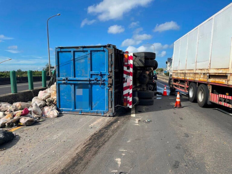 更新/台61線大園路段大貨車爆胎翻覆 裝載回收物散落車道交通受阻5小時