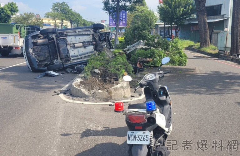 男子自撞分隔島、車側翻成立筊。 【記者爆…