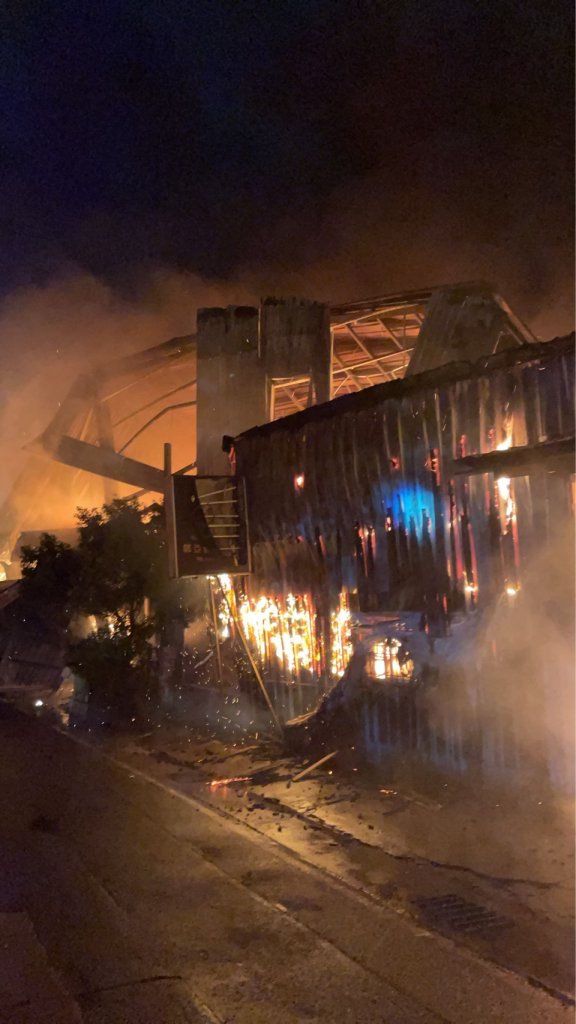 新豐鐵皮家具倉庫火警火勢猛烈。翻攝畫面 …