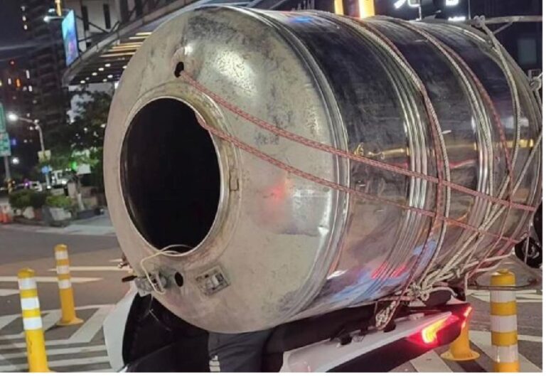 (台灣機車無極限竟載水塔上路。圖/ 翻攝爆…