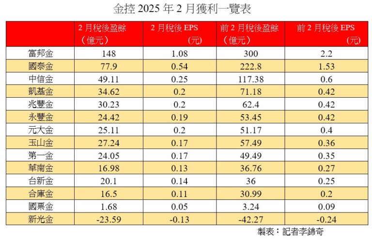 金控2月獲利全部出爐,其中,富邦金稅後淨…