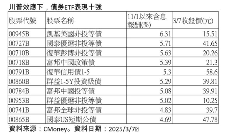 債券ETF績效10強出列!近5個月含息報酬4.6%起跳 00945B領先