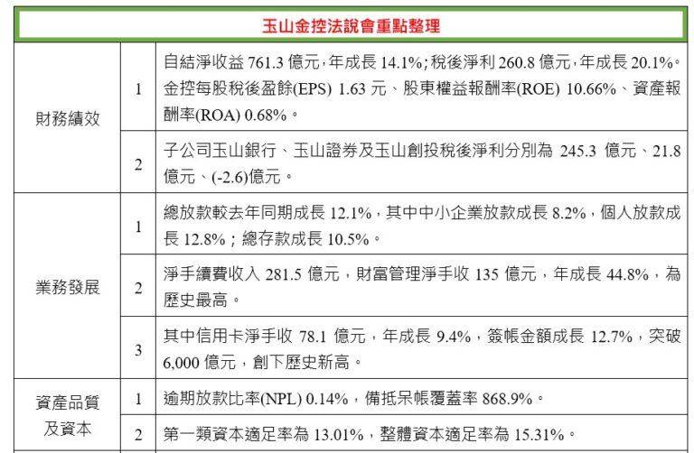玉山金今天召開法人說明會,董事長黃男州…