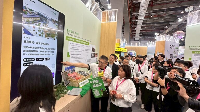 嘉義市長黃敏惠於展場體驗AI旅遊書。圖/嘉…