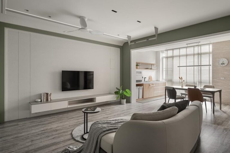 ▲開放式客餐廚以淺色水平百葉簾統一立面,…
