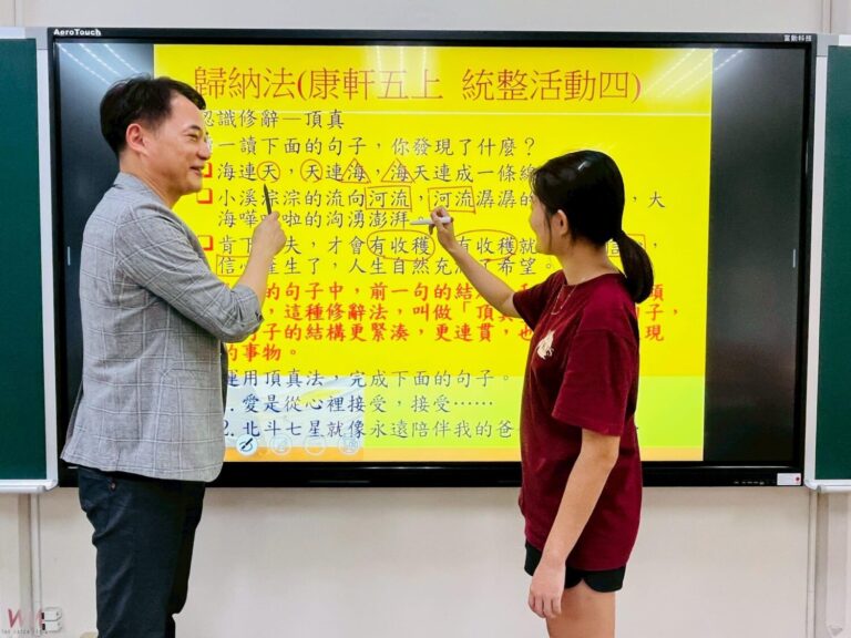 師生運用觸控螢幕進行語文修辭探討。(圖/…