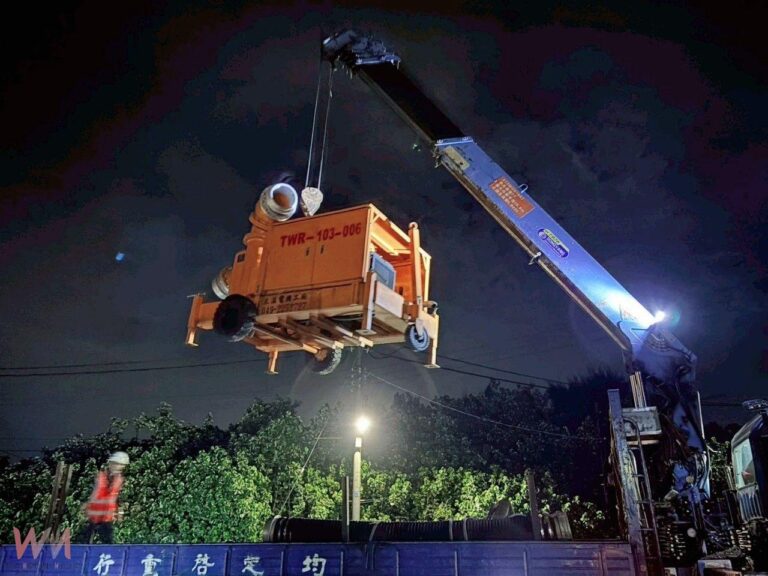 吊運抽水機至定點。(圖/中市府水利局提供…