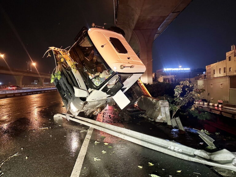 國道桃園南崁匝道聯結車自撞護欄 後方車斗…