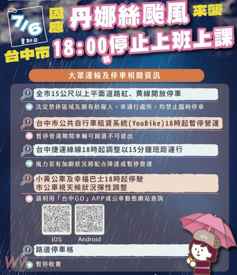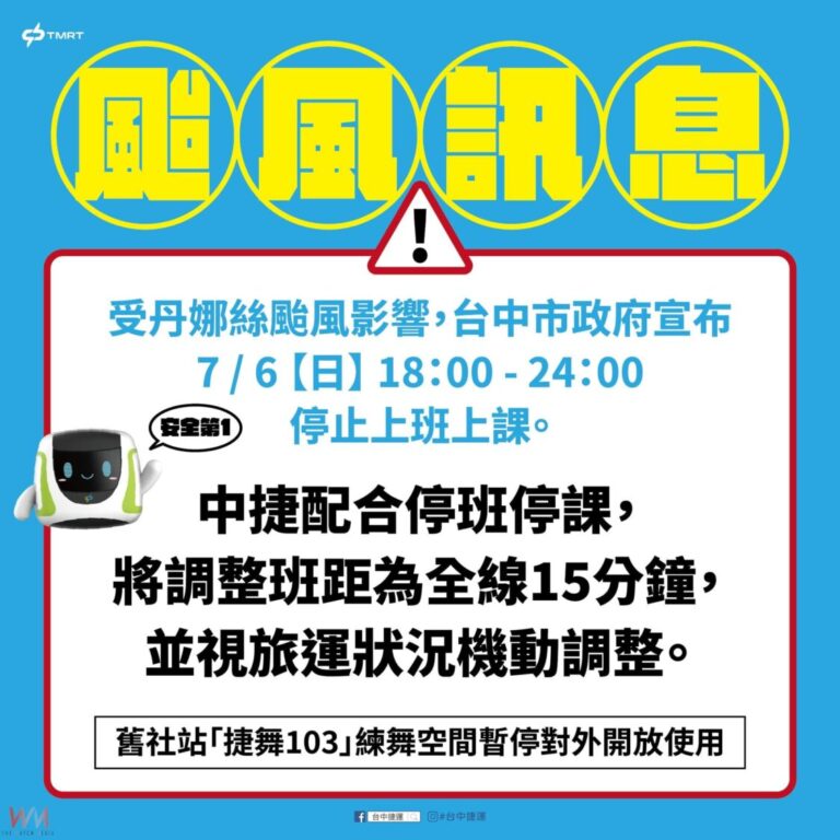 因應颱風來襲,台中捷運7月6日晚間調整班…