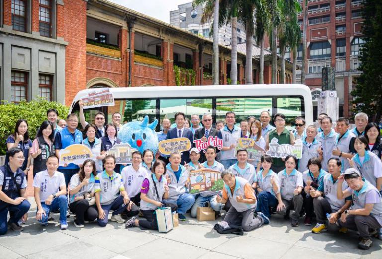 ▲邱臣遠代理市長與貴賓在觀光巴士前大合照…