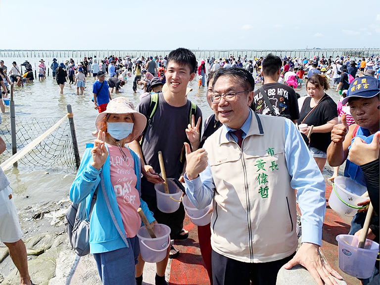 ▲黃偉哲市長到六孔碼頭與挖文蛤民眾互動,…