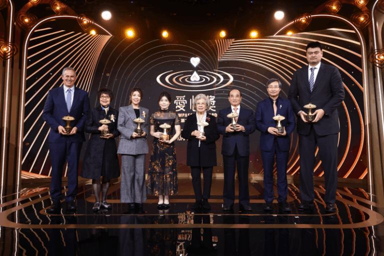 本屆愛心獎八位得獎者於典禮現場合影,每…