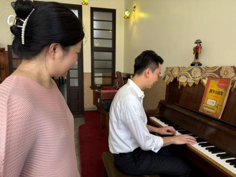 ▲鄭朝方市長在舊有鋼琴順手彈奏。(圖/記者…