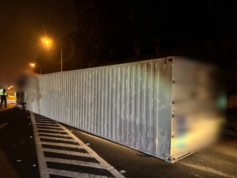 國道1號貨櫃車翻覆貨櫃掉落路面。翻攝畫…