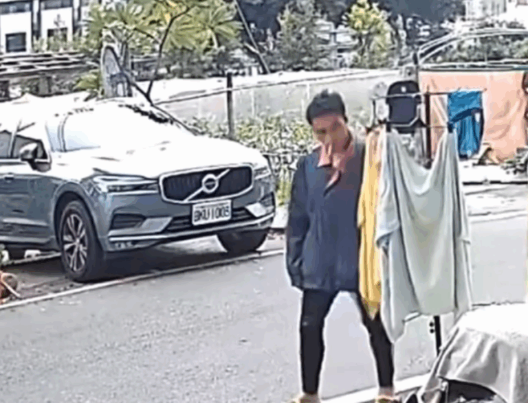 叼煙男子將滷肉飯便當掛在民前的曬衣架上…