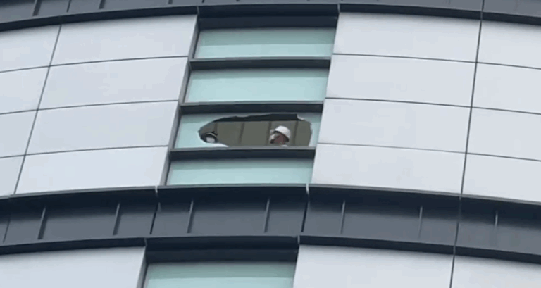 台中新光三越百貨8樓玻璃幕被強風吹起異物…