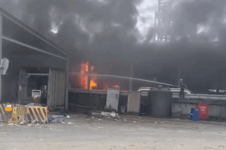 屏東工廠火警火勢猛烈濃煙沖天,消防隊員…