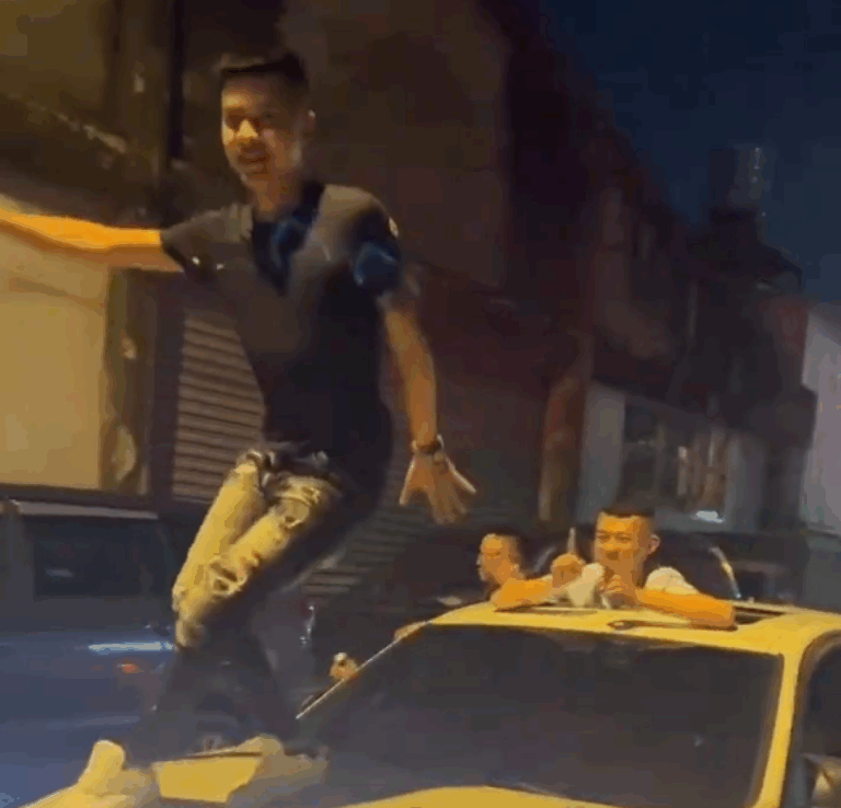 男子站在行進車子引擎蓋上擺動身驅還錄影P…