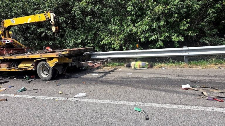 大貨車撞擊拖吊車,造成駕駛被撞飛路邊傷…