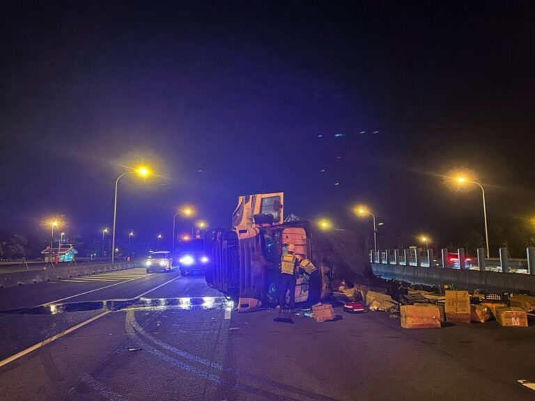 國道運菜聯結車爆胎翻覆,裝菜箱散落車道…