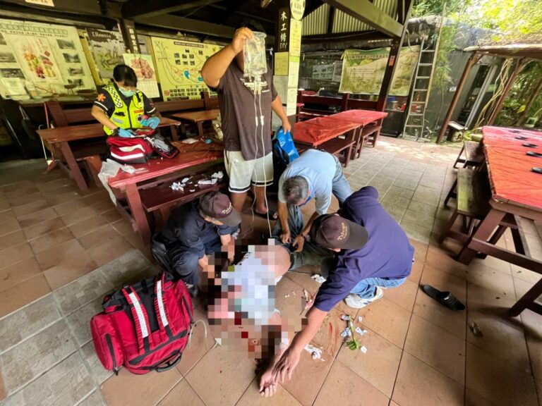 消防隊員到場為遭到虎頭蜂螯男子急救。翻…